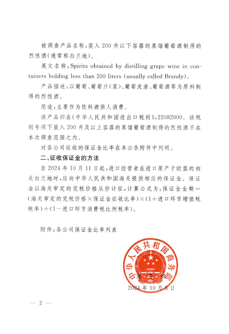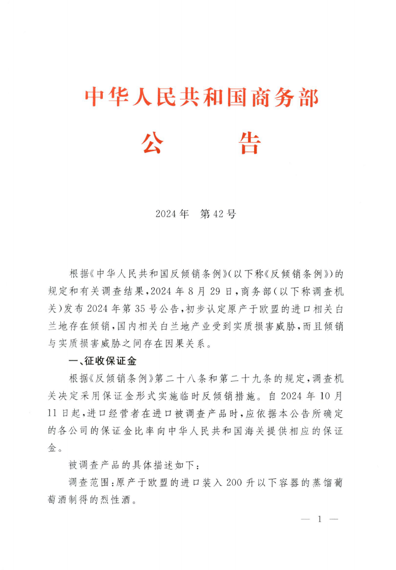 商务部公告2024年第42号 关于对原产于欧盟的进口相关白兰地实施临时反倾销措施的公告