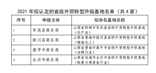 根据《山西省外贸转型升级基地管理办法(试行)》要求,在地方申报和专家评审的基础上,拟将山西省忻州市岢岚县省级外贸转型升级基地(农产品)等4家基地认定为2021年省级外贸转型升级基地,现予以公示,公示期限为2021年11月23日-2021年11月29日24时。如有异议,请于公示期内以书面形式向省商务厅外贸处反映(注明通讯地址和联系方式)。单位提出异议的,应当在材料上加盖本单位公章;个人提出异议的,应当在材料上签署本人真实姓名(姓名不能打印)。